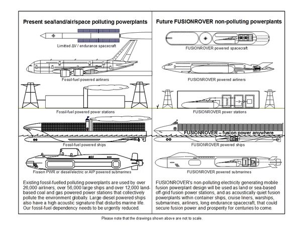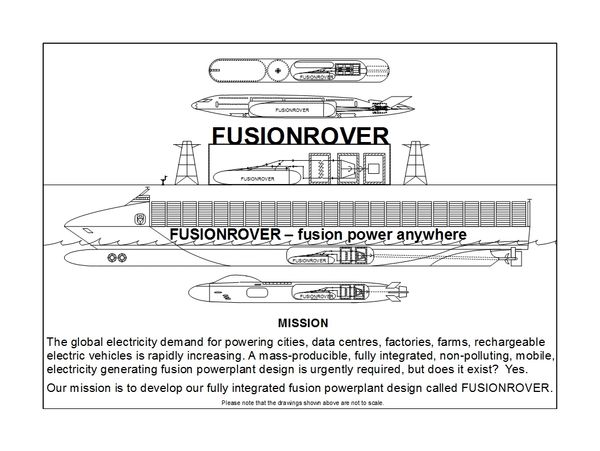 Dr Gary Sewell has gone back to the drawing board and has developed a disruptive FUSIONROVER fusion powerplant design that is uniquely fully integrated, modular, maintainable and is sufficiently compact that it is designed to be used as a mobile land, sea, air, space fusion powerplant. Using Health & Safety Executive HSE and not ONR regulated Hydrogen plasma fuel means that there are no chain reactions and no explosion risks, so making the exportable FUSIONROVER design inherently safe to operate globally. FUSIONROVER's are designed to produce clean electricity for cities, data centres, desalination plants, factories, farms, rechargeable vehicles and bikes. Potentially, mass-producible/exportable FUSIONROVER's could be the fusion powerplant and transportation decarbonisation and electrification solution that is urgently needed to secure fusion power and prosperity for centuries to come.